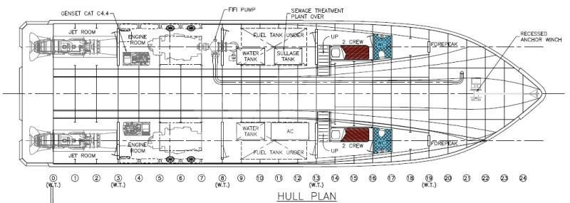 Engines : 2 x Caterpillar / Caterpillar Inc C32 ACERT, 2.386 kw, 2.300 rpm, Propellers 1 Water Jet (Port Side) + 1 Water Jet (Starboard)
